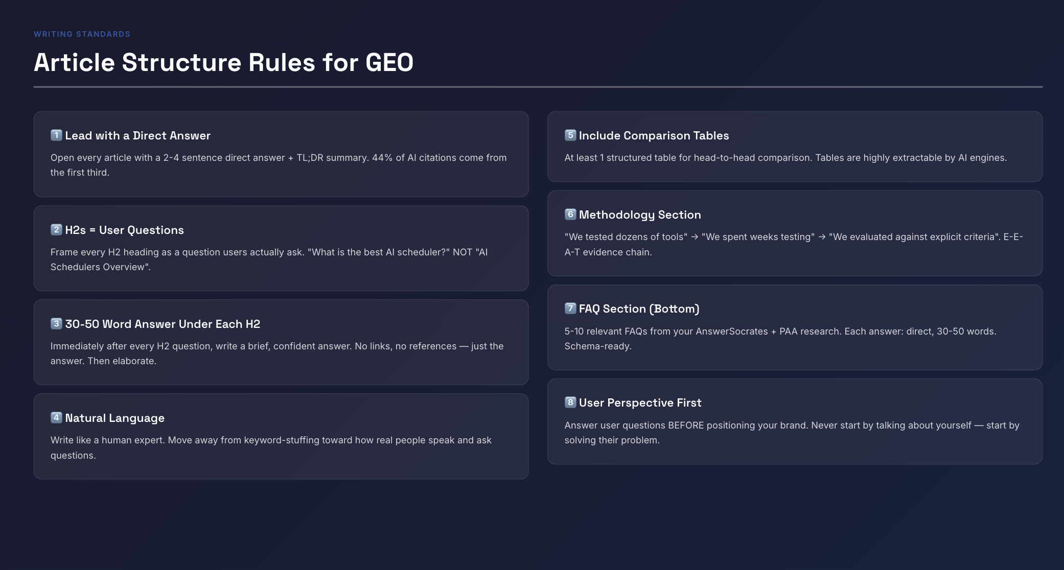 Create self-contained answer blocks. Each section should be independently extractable -- a complete answer that makes sense without reading the rest of the article.
