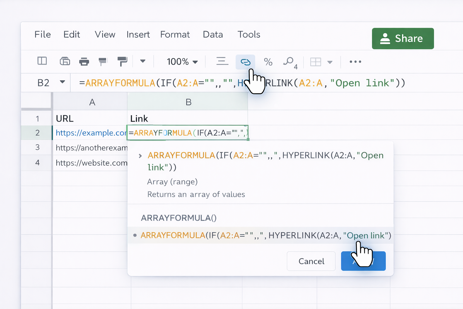 This ensures every link follows the same structure. 3. Use ARRAYFORMULA for whole columns: Turn that into: