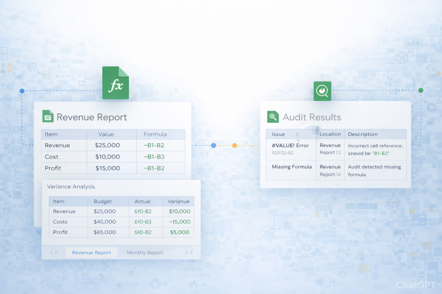 This is exactly the kind of repetitive debugging work an AI computer agent should handle. You can teach an agent to open key Sheets, toggle formula view, scan for oddities like broken references or inconsistent ranges, and log what it finds. Instead of a founder or head of ops running late‑night checks before a board call, the agent becomes your tireless spreadsheet auditor, quietly inspecting every formula before you ever see the numbers.